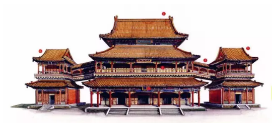 以多座建筑合組而成的宮殿、官署、廟宇,乃至于住宅,通常均取左右對(duì)稱之布局。一切組織均根據(jù)中線以發(fā)展,其布置秩序均為左右分立,適用與禮儀之莊嚴(yán)場(chǎng)合。公者如朝會(huì)大典,私者如婚喪喜慶。