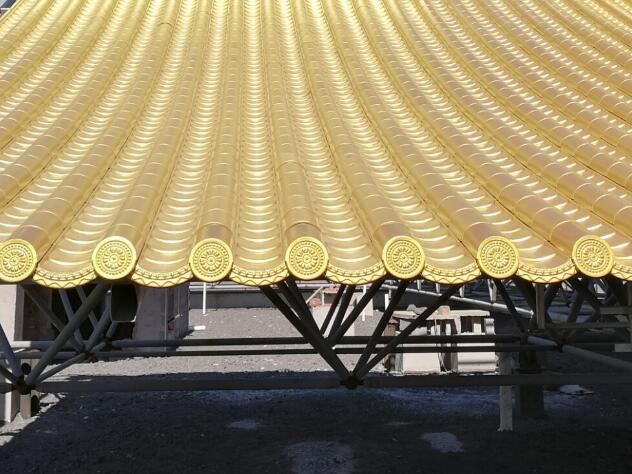 瓦件:大屋頂上的瓦件分成三類:屋面瓦件、屋脊瓦件和吻獸。屋面瓦件包括板瓦、筒瓦、勾頭瓦、滴水瓦、帽釘。 屋脊瓦件包括正、垂、戧脊上的瓦件和裝飾。吻獸包括正吻、垂獸、戧獸、仙人走獸、套獸。