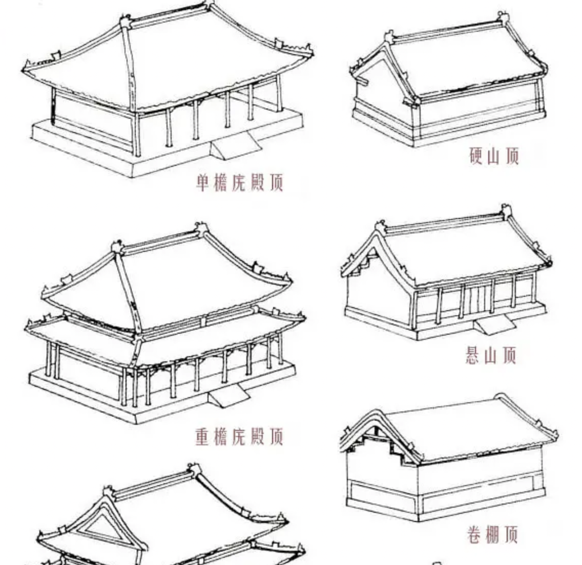 中國古修磚瓦傳統(tǒng)屋頂有以下七種,其中以重檐廡殿頂、重檐歇山頂為 級別最高,其次為單檐廡殿、單檐歇山頂。