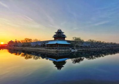 對(duì)于屋面曲線與屋檐起翹,或可將其歸因于中國(guó)傳統(tǒng)文化中追求的“天人合一”。建筑屋頂曲線和起翹的飛檐產(chǎn)生一種升騰感,呈現(xiàn)出飛向天空的動(dòng)勢(shì),形成一種對(duì)天穹的向往。而故宮角樓守衛(wèi)著天子居住的紫禁城,正是這種觀念的最好代表。
