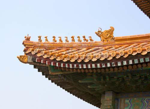 從垂脊獸上還看出建筑的等級(jí)。垂脊獸,又稱作仙人走獸,走獸,戧(qiāng)脊獸等,位宮殿建筑廡(wǔ)殿頂?shù)拇辜股。脊獸由瓦制成,分為琉璃瓦和黑活瓦(磚雕瓦)兩種,古代律法森嚴(yán),琉璃瓦多數(shù)為皇家使用,老百姓家只能用黑活瓦。垂脊獸越多,建筑物的等級(jí)也就越高,最多的為故宮太和殿,有10個(gè)垂脊獸,乾清宮為9個(gè)垂脊獸,象征著皇權(quán)的至高無上。除皇宮建筑外,山東曲阜的大成殿,因是祭祀先師孔子的建筑,也為9個(gè)垂脊獸,其它建筑物多為3、5、7個(gè)走獸