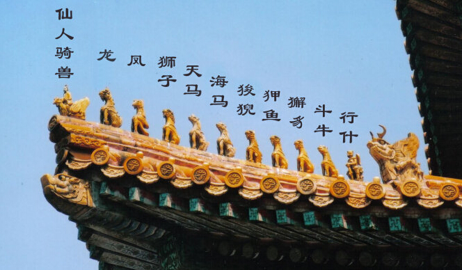 等級較高的琉璃瓦岔脊上,在走獸最前端的是帶領(lǐng)水軍的仙人,仙人騎在雞背上。在宋遼金時代仙人的位置是儐伽或力士。仙人臉上有三鬃長髥。相傳他是春秋時期齊國國君齊愍王。由于他昏庸無道,便讓他處在屋角的頂端,如再前行就會跌下地,寓有“懸崖勒馬”、“走投無路”的警戒之意。仙人身后的走獸依次為一龍-四海龍王、二鳳-四方禽王、三獅子-諸獸之王、四天馬-巡空獸、五海馬-分水獸、六狻suan猊ni-日行千里送信、七牙魚-海中調(diào)度、八獬豸(xie zhi)-獨角神羊、九斗牛-統(tǒng)土攔水、最后一個跳閘叫行什-催云布雨的雷公,因為多面算起,它排在第10位。
